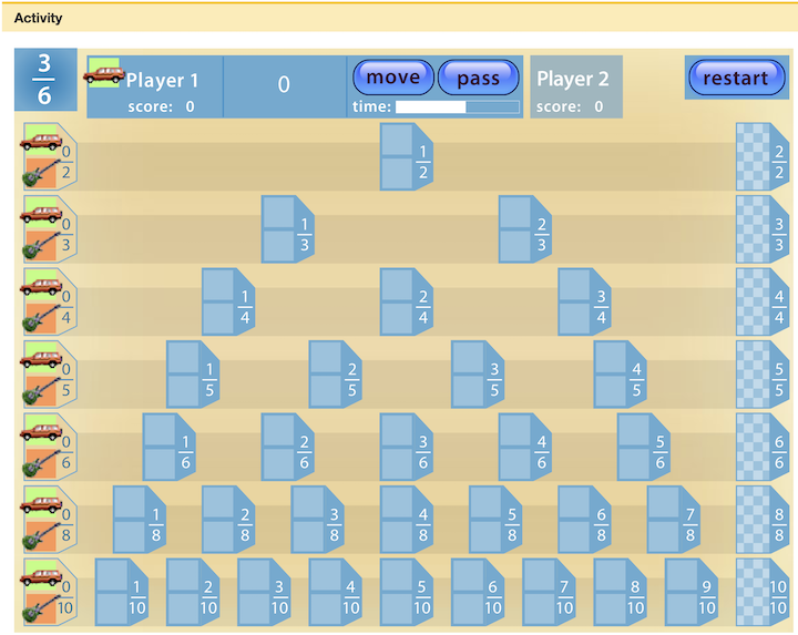 | Fraction Tracks Game In this two-player app board game, students take timed turns racing to the end of each fraction line by moving one or more of their markers to a given fraction value. Options include a pass and restart button. Directions: Player's target fraction appears in the upper left corner. The player moves his/her piece(s) so that the sum of the moves is a fraction that is equal to the target fraction. Goal: Get all the player pieces to the right side of the game board. Click to play. |